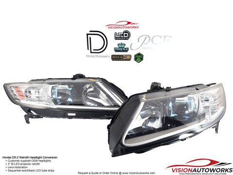 This is a headlight modification package for OEM Honda CR-Z (2011-2016) headlights. We require your OEM headlights sent in for these modifications, but offer an option to acquire brand new lights. After our modifications, your headlights will have better lighting performance and customized styling, best of both worlds.